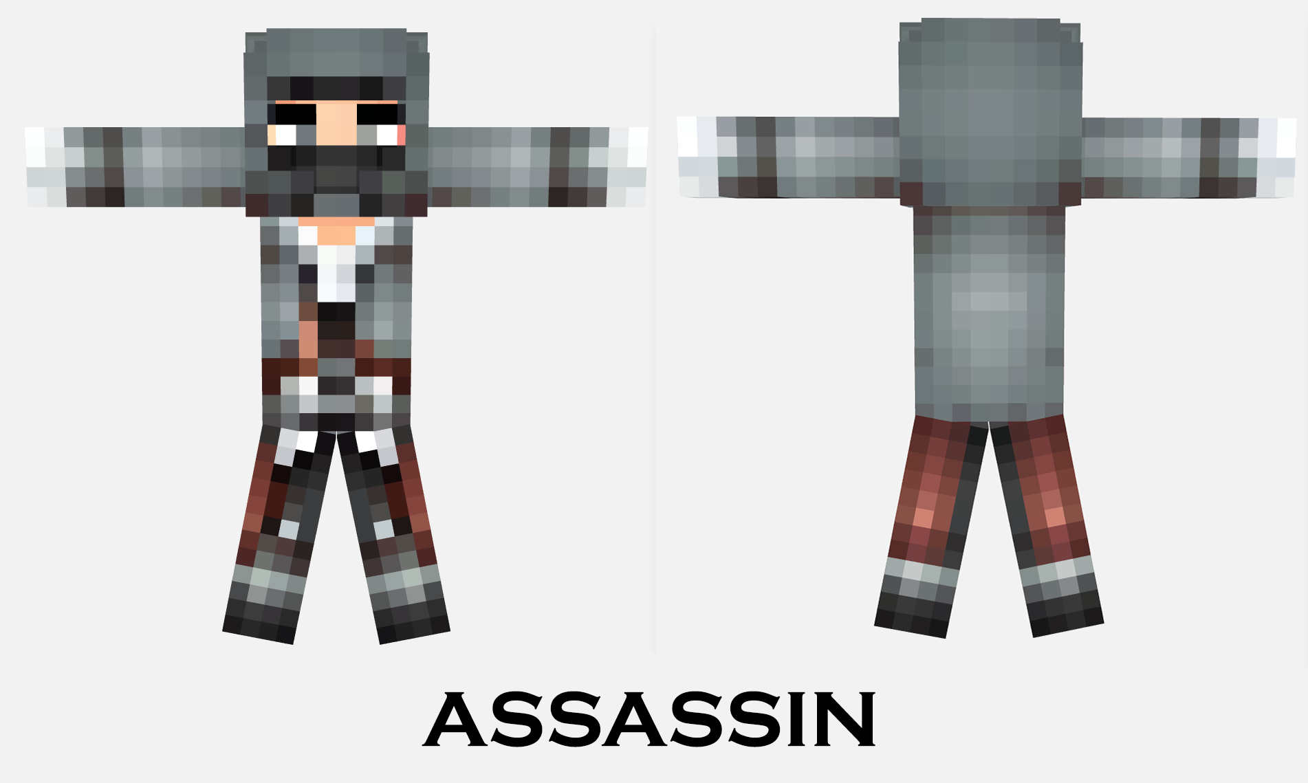 Become the silent predator of the Minecraft realms with the “Assassin” skin, a sartorial choice that speaks to the art of stealth and precision. Enveloped in a tapestry of muted grays that blend seamlessly into the dusk and dawn landscapes, this skin is accentuated with hints of deep, blood red, symbolizing the deadly skills of its wearer. The hooded visage masks expressions, keeping intentions as hidden as the player’s movements. With eyes peering from the shadows, this assassin is a ghostly presence in the game, a whisper in the virtual winds, and a legend in every server. This skin isn’t just a costume; it’s an identity, a statement of prowess for those who strategize every move, strike with intent, and vanish before the echo of their deeds fades.