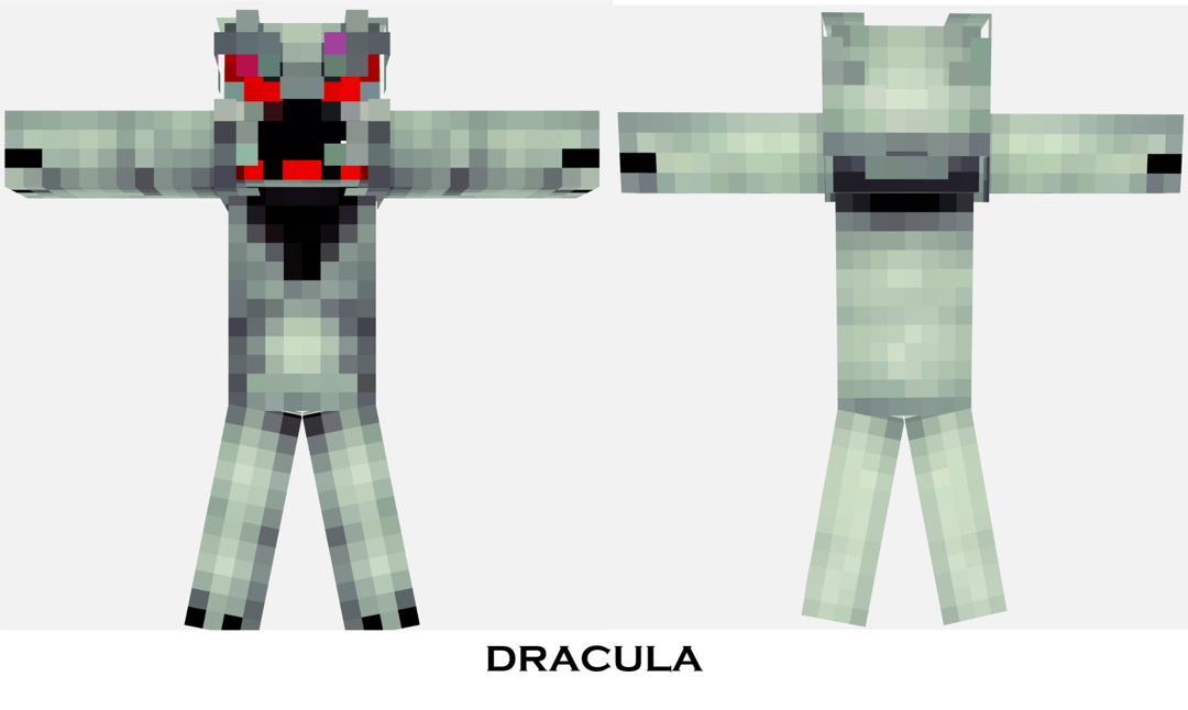 This skin presents an intricate and creative interpretation of the iconic character Dracula, inspired by the legendary figure from Bram Stoker’s timeless horror novel. Envisioned in a pixelated art style characteristic of the Minecraft universe, it features a palette dominated by shades of gray, suggesting a cloak or armor-like attire, fitting for the nocturnal and aristocratic nature of a vampire. The face is rendered with a ghastly pale complexion, which contrasts sharply with the menacing red eyes and the pronounced vampire fangs, highlighting the predatory nature of this undead creature. The attention to detail extends to the suggestion of a high-collared cape and a structured torso, evoking the elegant, yet ominous, presence that Dracula commands. This skin merges the classical elements of the vampire mythos with the blocky, digital realm of Minecraft, offering players an opportunity to embody the master of the night in their gameplay, striking fear into the hearts of both villagers and players alike.