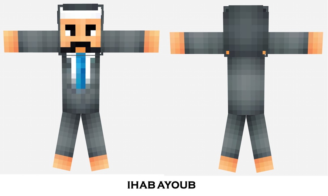 The “Ihab Ayoub” Minecraft skin is a perfect blend of professionalism and sophistication, tailored for players who wish to project a refined and distinguished persona in the game. The character is impeccably dressed in a sleek, dark gray suit that exudes a sense of authority and elegance. The suit is complemented by a crisp white shirt, which provides a clean and sharp contrast to the darker tones. Adding a splash of color and flair, the character dons a striking blue tie, meticulously tied to perfection, reflecting attention to detail and a polished demeanor.