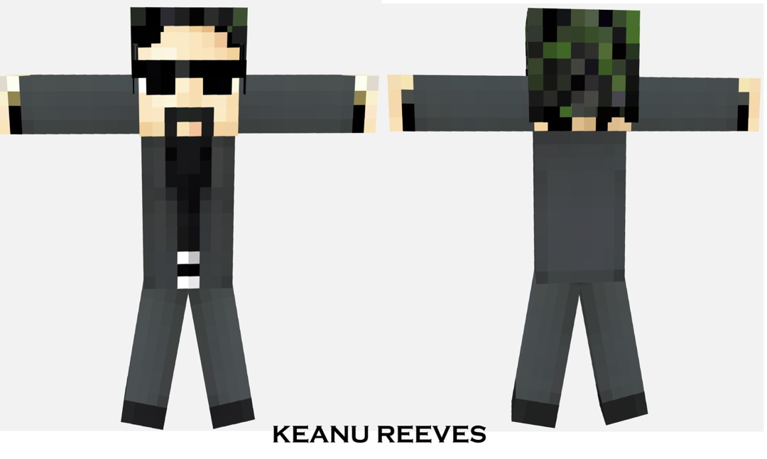 This skin represents a creative Minecraft interpretation of Keanu Reeves, capturing the essence of his characteristically calm and cool demeanor through its minimalistic yet striking design. The skin is decked out in a classic black suit, reminiscent of Reeves’ famous role as Neo in “The Matrix” series, complete with the characteristic dark sunglasses that add an air of mystery and allure. The hair and beard are rendered in a simple yet effective style that mirrors his well-known public appearances.