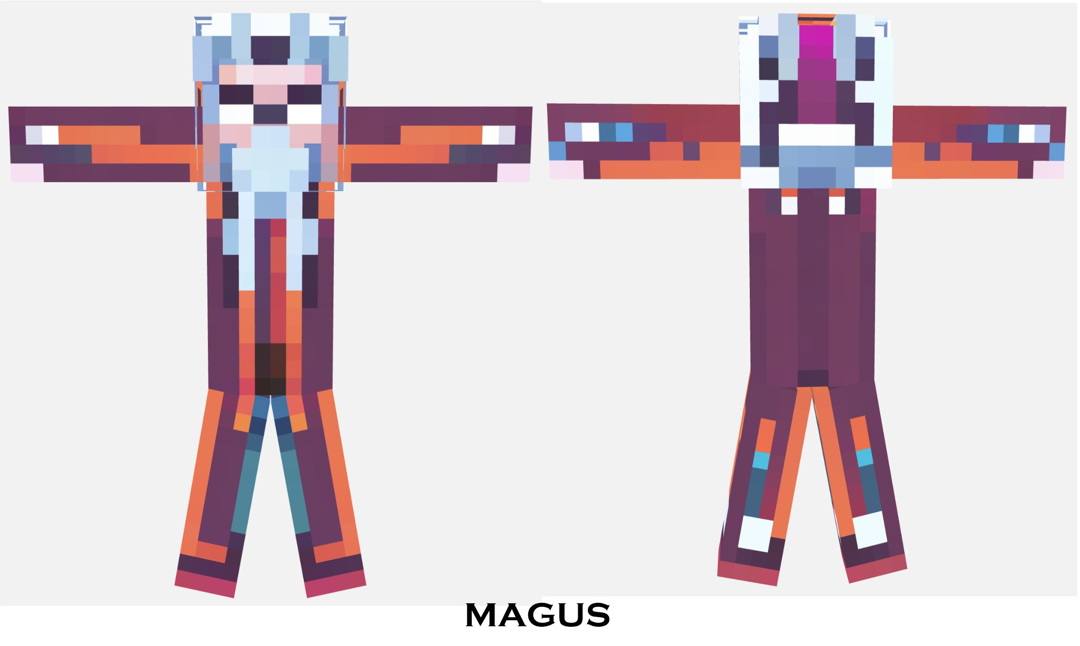 The “Magus” skin for Minecraft is meticulously crafted to represent a character steeped in sorcery and mysticism. This skin utilizes a rich color palette dominated by deep purples and blues, accented with vibrant oranges and reds, which might suggest a connection to both arcane and fiery energies. The design includes detailed geometric patterns across the torso and limbs, reminiscent of magical runes or spellcasting sigils that could be seen as enhancing the character’s mystical abilities.