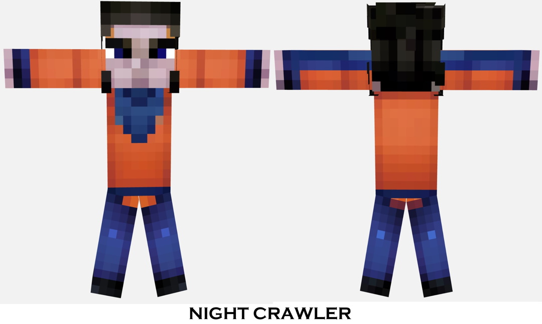 Overall, the Night Crawler skin exudes a sense of daring and intrigue. Its design is likely to appeal to players looking for an avatar that embodies the thrill of nocturnal escapades or the valiant flair of a superhero persona within the pixelated realms they explore and adventure through in their digital gameplay experiences.