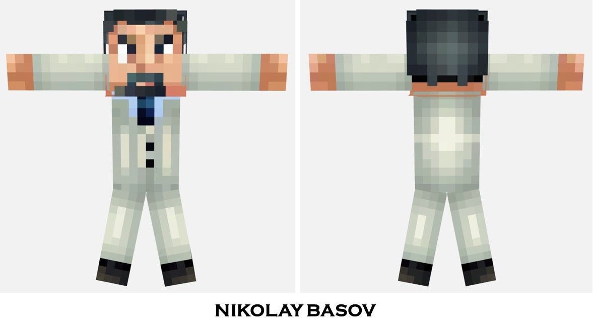 The “Nikolay Basov” Minecraft skin is a finely crafted representation that exudes sophistication and professionalism. The character sports dark, neatly combed hair that complements his well-groomed mustache and goatee, adding a touch of distinction to his appearance. His facial expression is calm and composed, reflecting a sense of wisdom and authority.