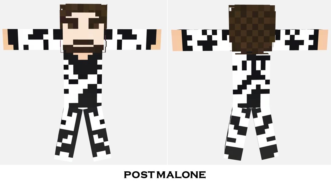 The “Post Malone” Minecraft skin is a detailed and stylish representation of a character with a modern and edgy appearance. The character is dressed in a striking black and white patterned outfit that immediately catches the eye. The pattern is bold and unique, giving the character a standout look that exudes confidence and individuality. The seamless integration of the black and white blocks creates a visually dynamic effect, perfect for players who want to make a statement in the Minecraft world.