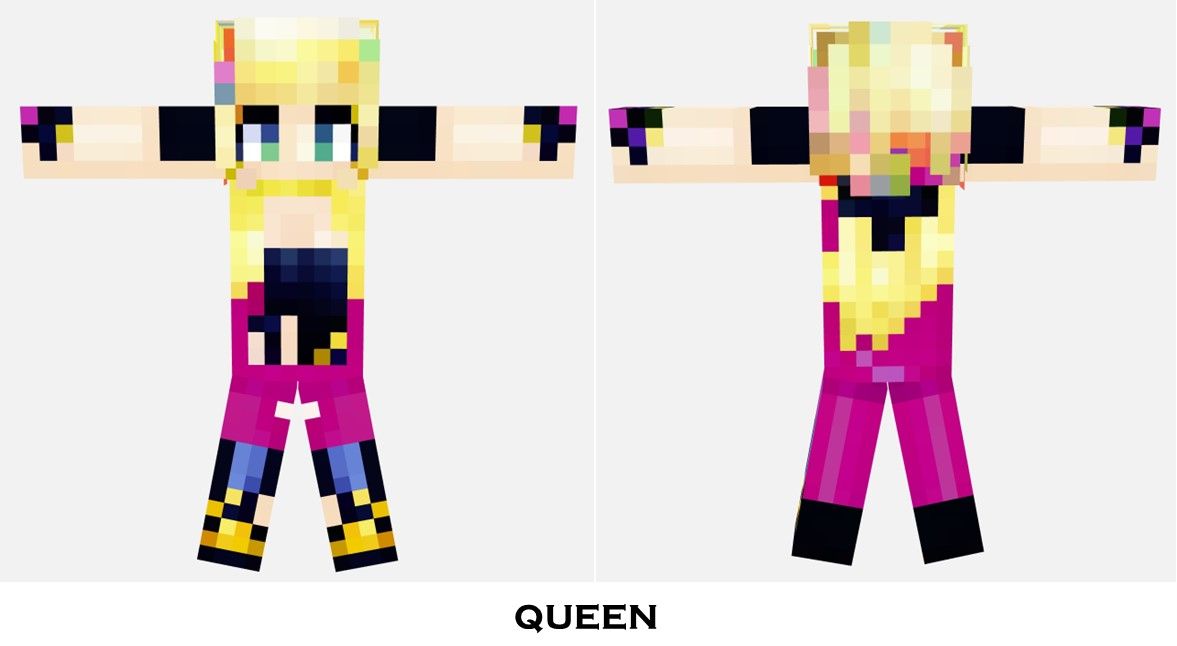 Overall, the “Queen” Minecraft skin is a testament to bold fashion and vibrant design, with its combination of elegant details, lively colors, and meticulous pixel art. It is an excellent choice for players who want their character to reflect a sense of contemporary style and regal flair, standing out in the Minecraft world with a unique and fashionable presence.