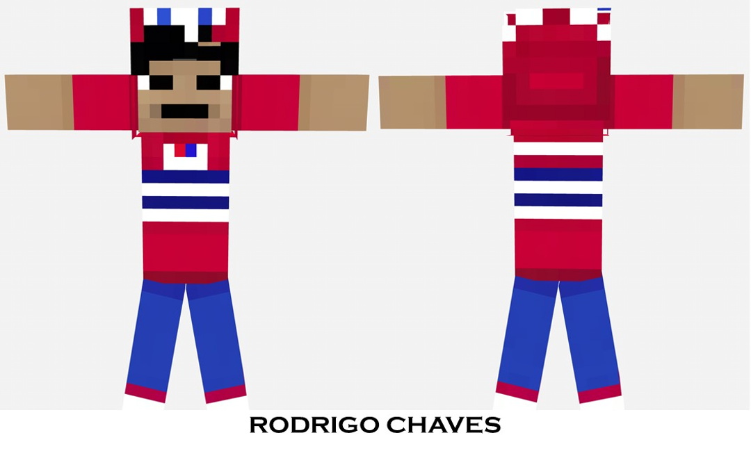The back of the skin mirrors the front in terms of design, with the same red, white, and blue horizontal stripes running across the back of the shirt. The pixel art style used in the creation of this skin allows for clear and recognizable features, making it easily identifiable as Rodrigo Chaves.