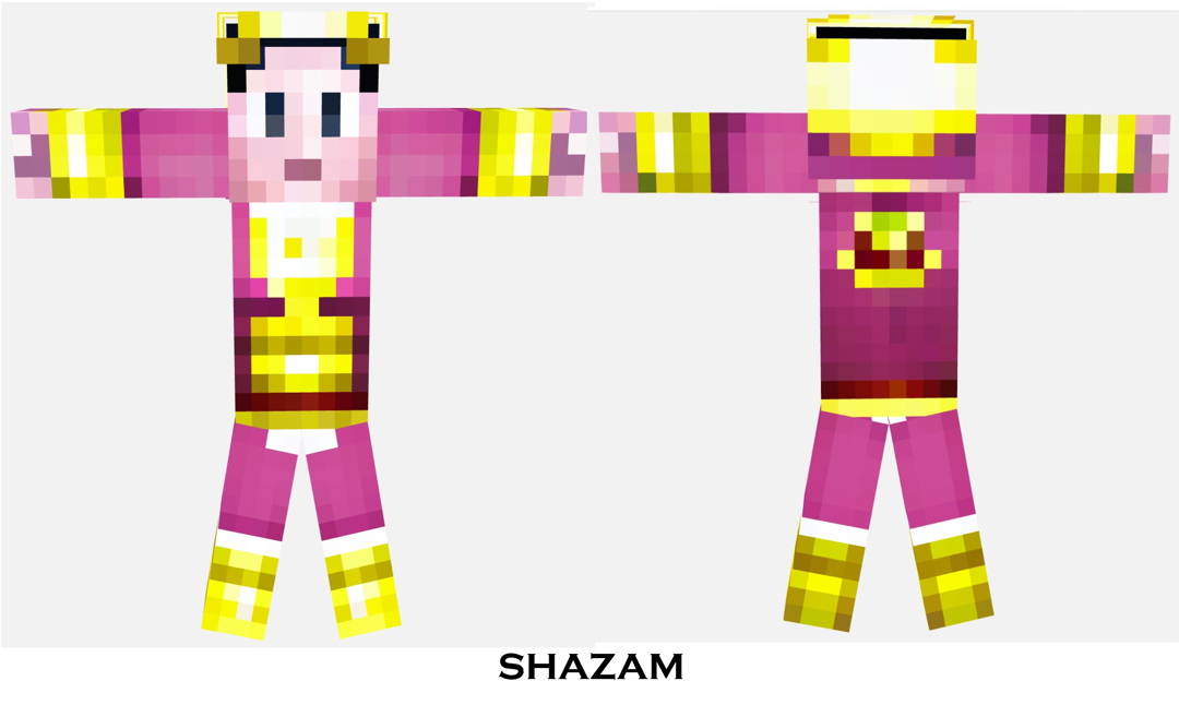 The “SHAZAM” skin design presents a visually striking persona, reminiscent of the classic comic book superhero archetype. The primary color palette consists of a deep magenta that covers the majority of the body, creating a bold statement that is both eye-catching and distinctive. This magenta is accentuated with bands of vibrant yellow that adorn the wrists, waist, and lower legs, providing a sharp contrast that enhances the heroic feel of the skin. Notably, the chest features a prominent lightning bolt emblem, a widely recognized symbol of power and speed that is central to the superhero theme. This emblem, combined with the color scheme, may be inspired by the iconic DC Comics character Shazam, who is known for his crimson and gold-clad attire and his association with magical lightning.