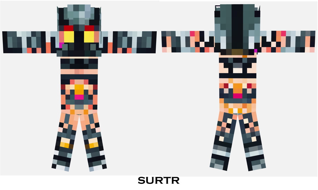 This skin is designed with a creative interpretation of Surtr, a figure from Norse mythology. It displays an intricate pixelated armor with a color palette that shifts from charcoal gray at the shoulders to fiery hues towards the feet, resembling the gradual intensity of flames. The headgear is detailed, showcasing a silver mask with glowing yellow eyes, invoking Surtr’s fierce and formidable presence. The body armor suggests layers, possibly indicating a hierarchy of protection with lighter tones around the chest that give way to a crisscross pattern resembling chainmail. There’s an inclusion of magenta and orange pixels around the torso, reminiscent of the colors of molten rock. The overall pixel art is a blend of combat readiness and mythological essence, aligning with Surtr’s depiction as a being engulfed in flames. The arms extend from gray shoulder pads to end in bands of red and gold, while the lower body features leggings that transition from darker to lighter shades, ending in greaves accented with yellow stripes at the boots, giving a digital yet authentic warrior’s aesthetic.
