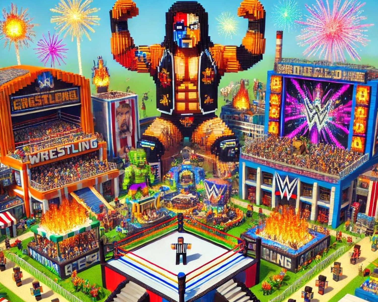 Minecraft fans have created impressive arenas resembling WrestleMania, featuring towering stages, fan-packed stands, and LED boards for match highlights.